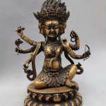 The ritual dimension of Parnasha is most directly indicated by the vajra (bronze scepter; translates: thunderbolt and diamond) she bears. The vajra symbolizes her indestructibility as well as her adamantine insight into the illusory nature of all phenomena. A healer, to be effective, must have the wisdom to recognize ultimate insubstantiality of a disease if she or he is to envision its absence and accomplish its removal. Moreover, in tantric ritual a vajra is flourished with sacred hand gestures to channel energy. Thus, the vajra conveys that the healer works with the patients energy. The physical symptoms are understood as a tangible manifestation of a negative energy embedded in the patient’s psyche or a disturbance of the patients energies due to toxic substances, harmful psychological forces, or malevolent supernatural agency. A healer must discern the nature of a disease as a blockage in the energy flow and intervene to restore a balanced, healthy pattern. The vajra, as a tool for directing energy, addresses this metaphysical level of healing work. The scepter strikes through the physical manifestation to the core of the problem.